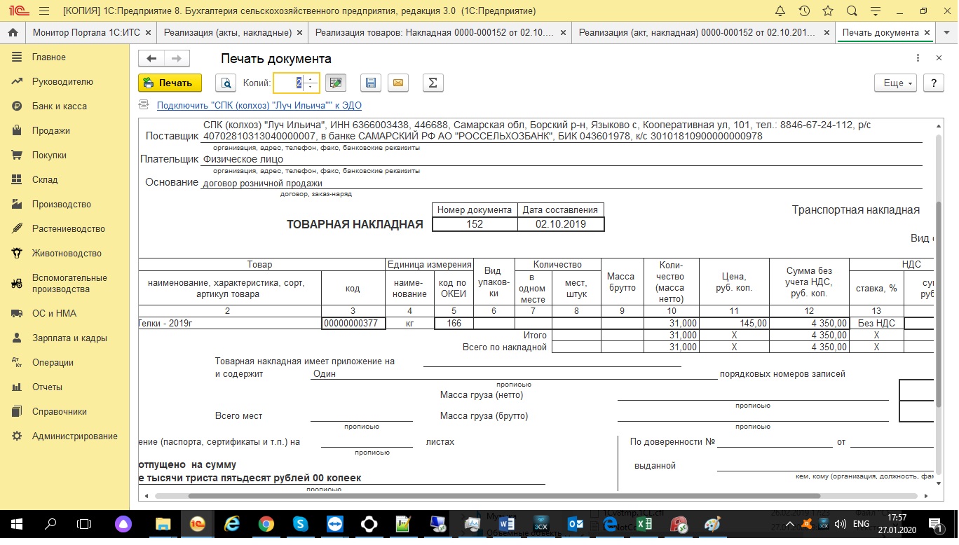 Во внешней печатной форме для БП сельскохозяйственного предприятия настроить отображение массы нетто и массы брутто согласно типовой форме.