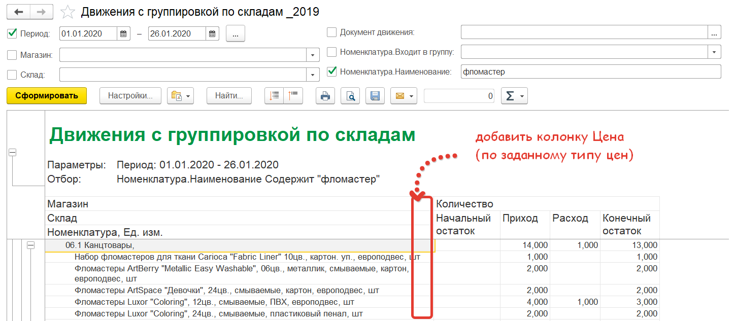 Требуется Отчет Движение с группировкой по складам с колонкой цена 1С:Розница, (2.2.13.12)