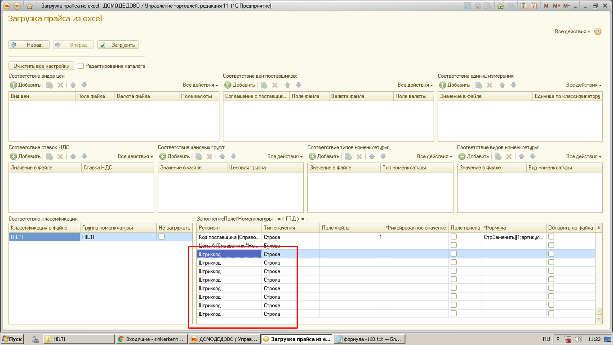 Поправить загрузку номенклатуры из excel добавить загрузку Штрихкода