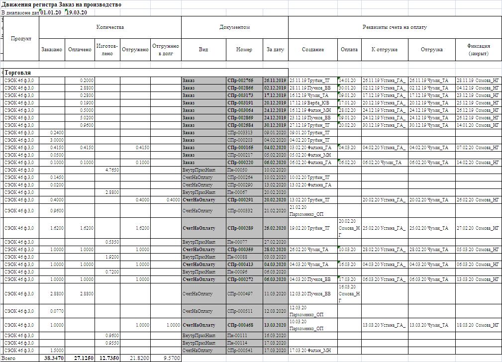 Здравствуйте. Нужна предварительная оценка стоимости. И способ оплаты(т.к. Мы - организация, оплата через расчетный счет.)Конфигурация УТ, ред 11.4. Нужен внешний отчет по количественным показателям номенклатуры (С итоговыми данными по группам и общим итогом) с отбором по складам в заданном периоде с колонками: номенклатура, заказано, оплачено, изготовлено(поступило на склад, склады по отбору), отгружено, отгружено в долг(долг должен сохраняться до полного погашения ), остатки на складе, наши долги(если заказ оплачен, но не отгружен, долг должен сохраняться до полной отгрузке по заказу в размере оплаты), а также вычисляемые колонки недопроизводство и перепроизводство.