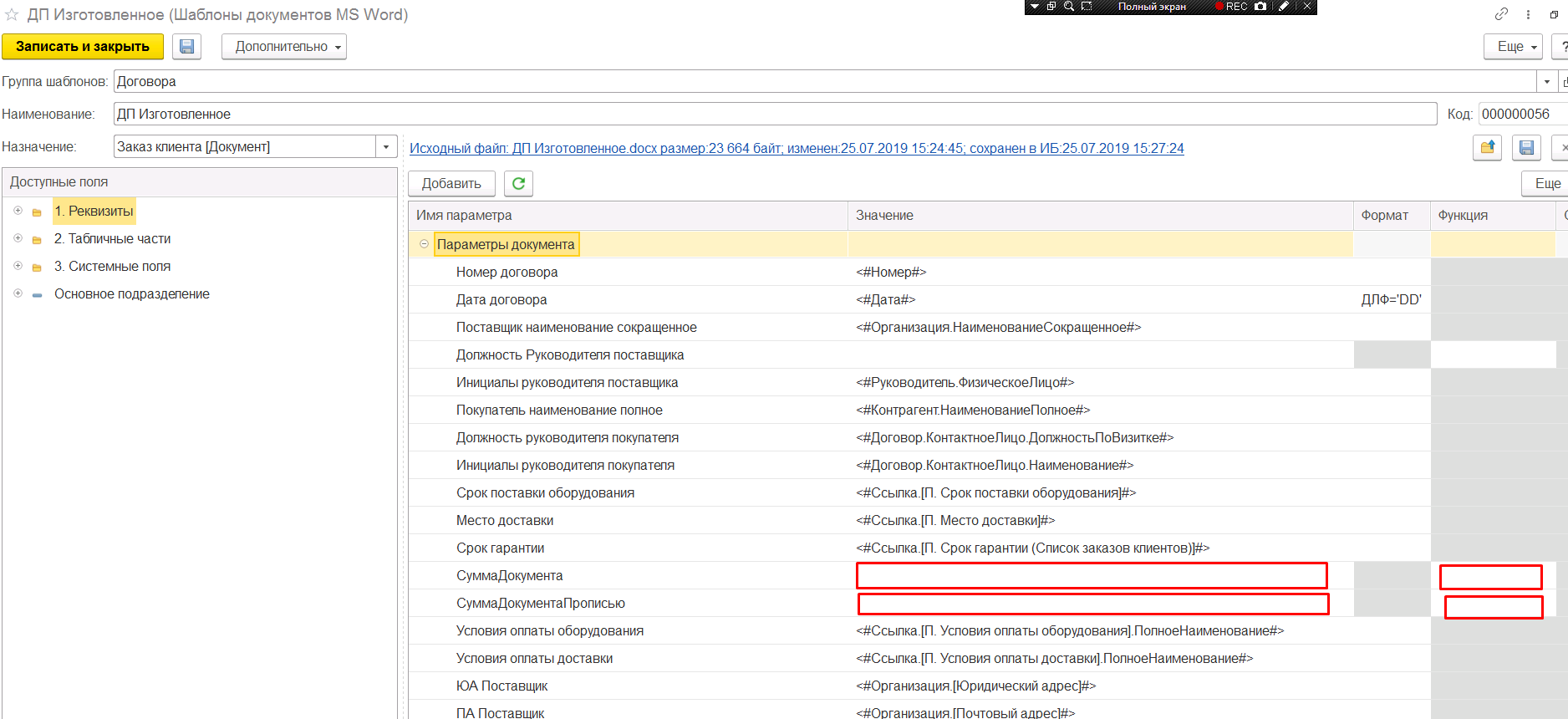 В шаблоне документов в Параметрах Сумма Документа и Сумма документа прописью не проставляются значения. В видео более подробно все изложено.