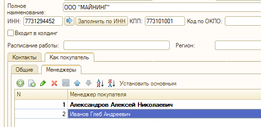 В карточке контрагента есть вкладка "Как покупатель", вкладка "Менеджеры" там список пользователей 1с.
