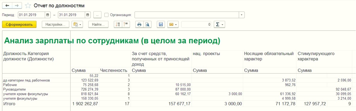 Отчет формируется за произвольный период времени в разрезе категорий должностей и видов выплат. Так же должно выводиться количество сотрудников по каждой категории должностей.