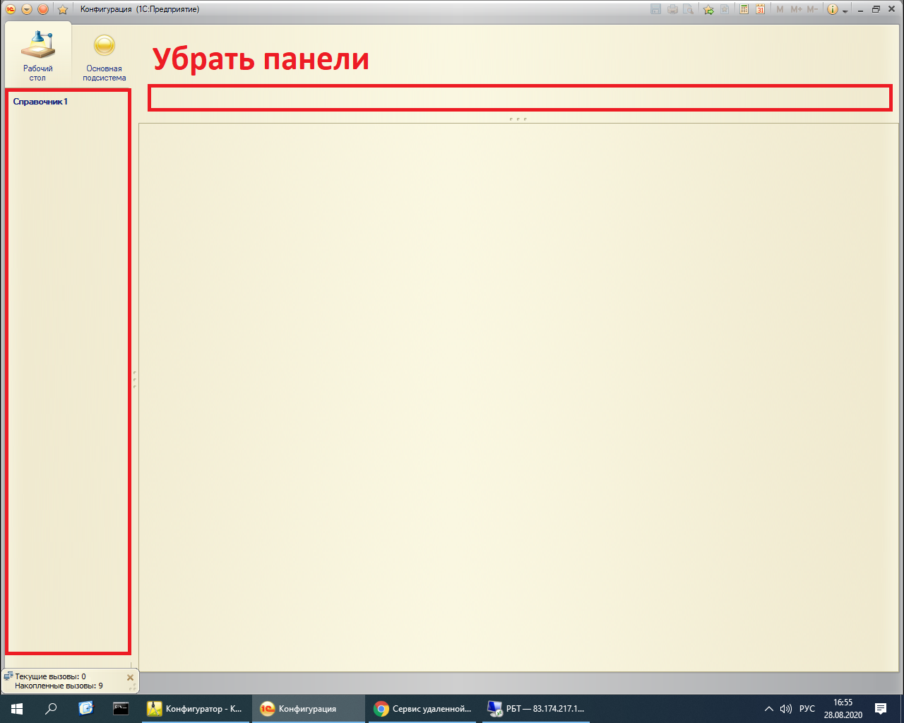 Все должно быть сделано через конфигуратор, не через настройку панелей в 1С предприятии.