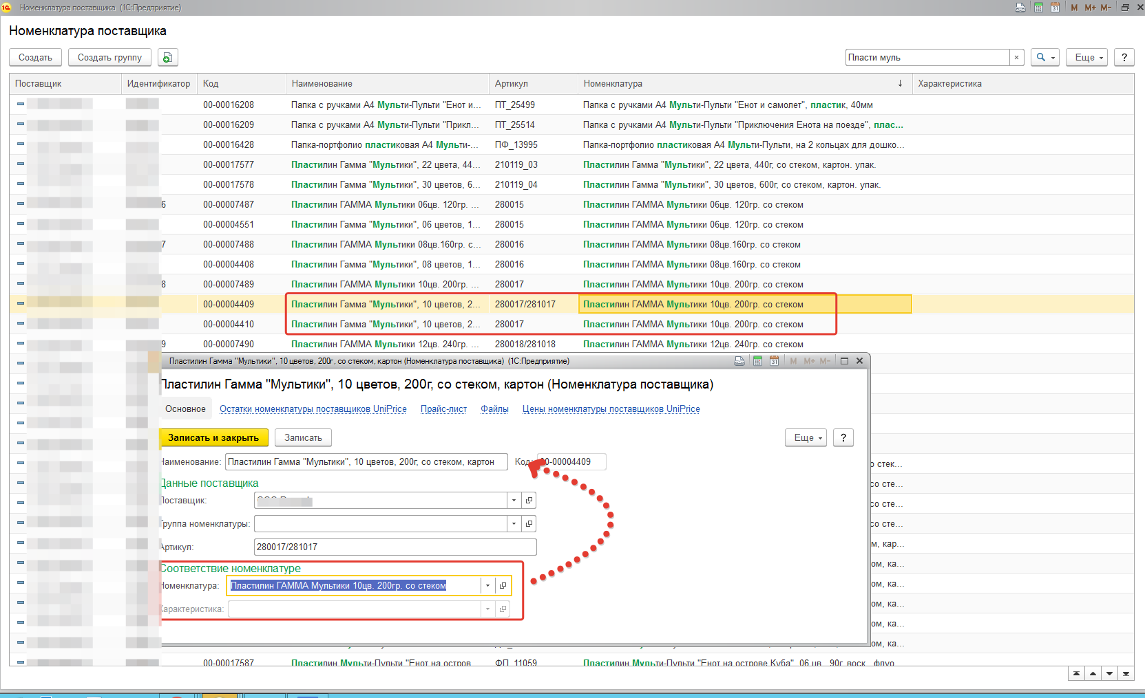 Напишу обработку, которая почистит номенклатуру поставщика. Только нужно будет выбрать критерий, по которому выбрать оставляемую запись (например, наименьший код Номенклатуры поставщика)
