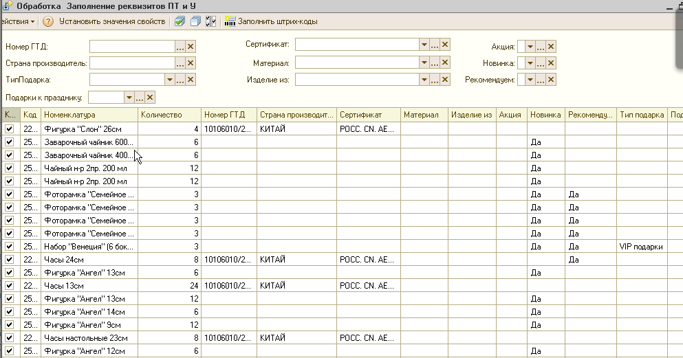 С помощью обработки устанавливаются различные свойства номенклатуры, пришедшей в документе.