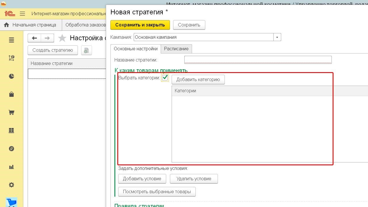 Есть расширение, нужно внести изменения. В Справочники->СтратегииПродаж->Формы->ФормаЭлемента. Вместо отбора по Товарной категории или виду номенклатуры нужно сделать "привычный отбор". Также в модуле надо подправить код что бы отбор правильно отработал и сохранял данные согласно логике предыдущего отбора. По кнопке "Посмотреть выбранные товары" должны отображаться товары по отбору.