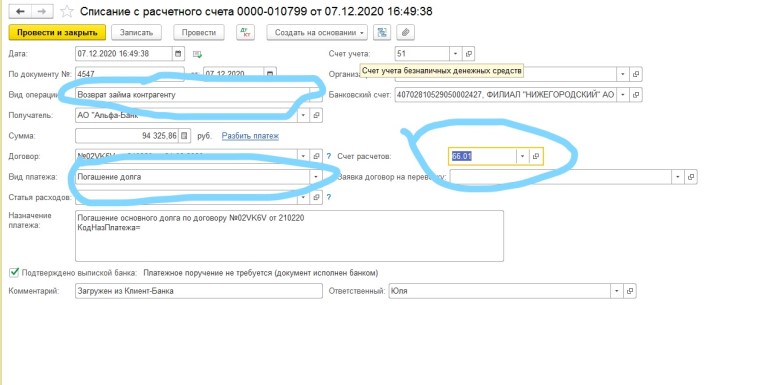 Требуется доработать обработку КлиентБанк, чтобы при загрузке выписки, документы "Списание с расчетного счета" по погашению займа, автоматически вставали с видом операции "Возврат займа контрагенту" и счетом расчетов, в случае процентов 66.02, в случае основного долга 66.01. Определять что это за погашение требуется по Назначению платежа.