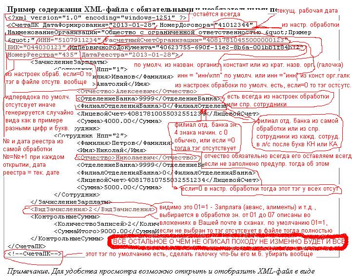 Старый текст Нашего ТЗ (убирать его не буду может что будет понятно из него будет кому-нибудь как дополнение к основному описанию): Писать (расписывать) всё это долго и муторно, но всё же как мог расписал в итоге всё. Всё что нужно предоставлю непосредственно уже только Исполнителю (md нашей рабочей конфы 7.7, примеры файлов, вн. выгрузку в виде готовой уже обработки, форматы файла и печатных форм реестров). При здраво выполненном ТЗ быстро, чётко и без лишних вопросов оплата точно увеличиться от гарантированной суммы на 500 руб. или за супервыволнение ТЗ очень быстро и совсем без вопросов и бэтатестов самого Заказчика то тогда - 1000 руб. плюсом к гарантированной, но не больше 3000 руб. за всё это задание (ТЗ), в других случаях увы только гарантированная сумма и всё. Пока что вкратце для Зарплата и Кадры 7.70.338 есть готовая внешняя полностью работоспособная обработка которая работала и работает до сих пор для Клиент-Сбербанка (уже устаревшего на сегодня) и формирует она Зарплатные и алиментные (это важно) реестры автоматом на основании документов Выплата ЗП и чего-то там ещё для алиментов увидете это сами уже. Формирует она разные печатные формы этих реестров (для зарплаты один и для алиментов тоже один) и грузит всё это в dbf-файл(ы). Нужно то-же самое только что-бы это грузилось в xml-файл(ы) и уже только для Сбербанка Бизнес Онлайна это дело нужно, уже для его Зарплатного проекта через xml-загрузку из 1С. xml-файл стандартный как например из той-же типовой зарплаты 7.70.338 в обмене данными со сбербанком РФ который есть, но нам там многое не подходит или отсутствует. Например там нет выгрузки Алиментов как у нас в dbf'e, и печатные формы реестров совсем не такие как с нас требуют у нас в банке в штатной выгрузке тоже нет и подобное. Так-же к новой выгрузке в Сбербанк Онлайн зарплатных реестров нужно будет прикрутить Настройку(и) (которая должна автоматически сохраняться при закрытии обработки) для выгрузки файла xml в правильном виде это типа такого что-то, через галочки, крыжики, переключатели и т.д. и т.п., по умолчанию всё есть, но: пихать в файл полное название конторы (по умолчанию) или сокращённое отсекание (убирание) лишних двойных кавычек в названии предприятия, убирание лишних пробелов в каких-либо тэгах xml-файла, убирание полностью тэгов отделение банка и филиал отделения банка (по галочке или если-в они не заполнены), убирание после ИНН слэша и само значение КПП с символа слэша полностью убрать всё это оставить только значение ИНН, все заглавные буквы ФИО превратить в нормальные только первые заглавные как обычно, остальные нет, убирание самого нижнего типа задвоенного тэга СчетаПК! с восклицательным знаком внизу если-в таковой имеется. Ещё одна главная настройка это длинна лицевого счёта сотрудника (в справочнике Сотрудники) она может быть у нас обычная это типа такого 40417510456030003030 и в файл и везде должно идти именно это и так-же ещё лиц. счёт может иметь вот такой вид 40417810726100111591ка5555, где 5555 филиал банка, а слово ка означает Карта Сбера, или так 42207810826100015874кн5555 где 5555 это филиал банка, а слово кн означает СберКнижка Сбера. Так происходит разделение на Карты и Книжки Сбера, это тоже нужно сделать в виде Настройки и разделять (или не разделять) подобное и в Печ. формах и в файле выгрузки xml, наряду с разделением на Зарплату(Авансы) и Алименты. Так-же нужно сделать ра