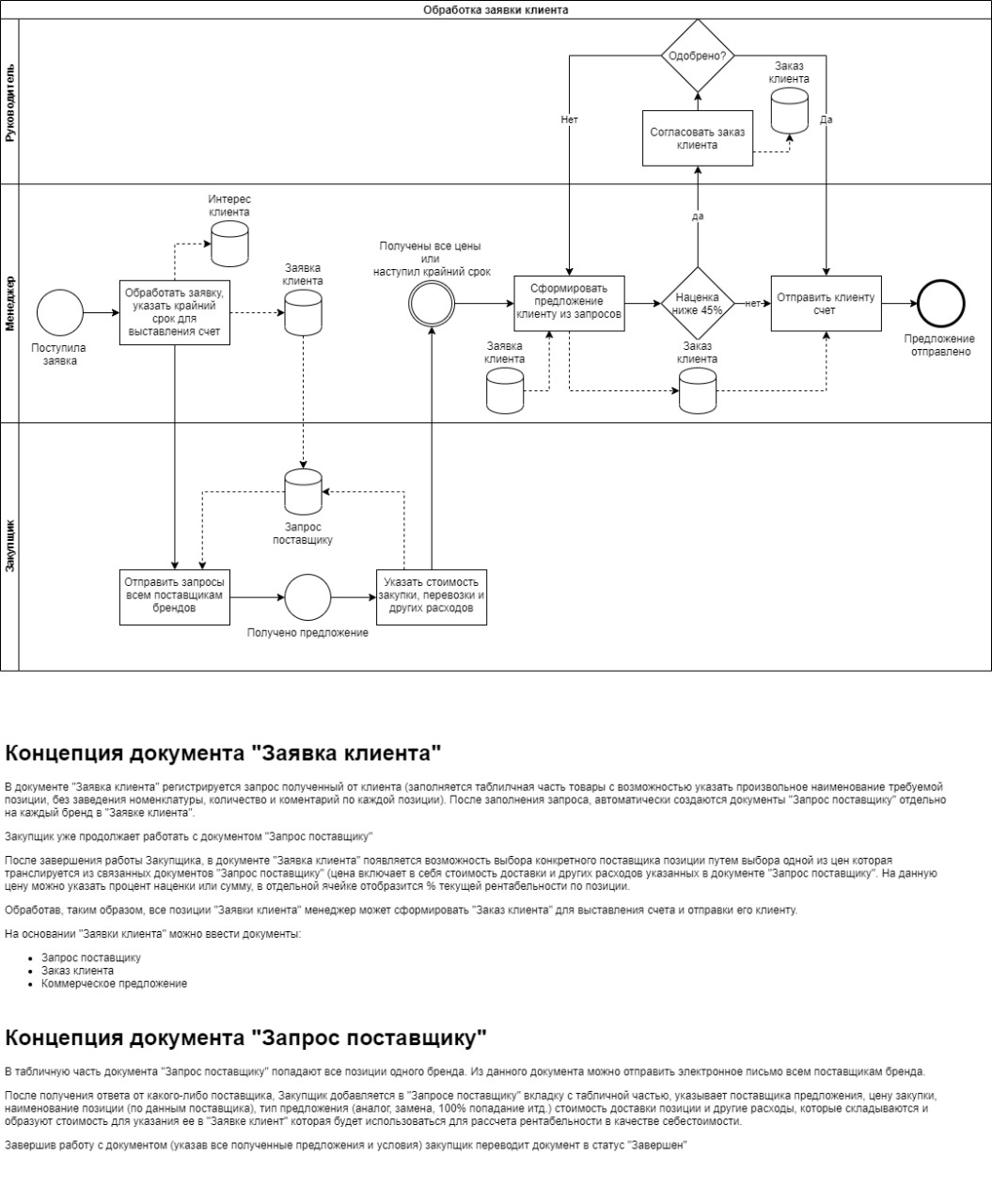 В документе "Заявка клиента" регистрируется запрос полученный от клиента (заполняется табличная часть товары с возможностью указать произвольное наименование требуемой позиции, без заведения номенклатуры, количество и комментарий по каждой позиции). После заполнения запроса, автоматически создаются документы "Запрос поставщику" отдельно на каждый бренд в "Заявке клиента".