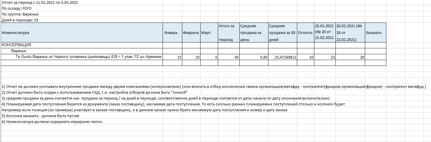 Остатки товаров по месяцам, средние продажи за день, даты желаемых дат поступления.