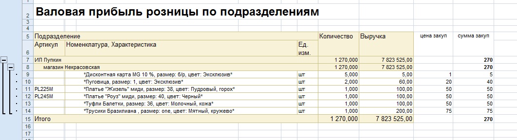 Нужно, чтобы было количество проданного товара (в системе ведутся только розничные продажи), сумма на какую продано, цена закупа (брать из регистра Себестоимость товара - да, там не совсем цена закупа, но брать нужно оттуда), сумма закупа - просто умножается на количество в соседнем столбце. Все как в примере во вложении.