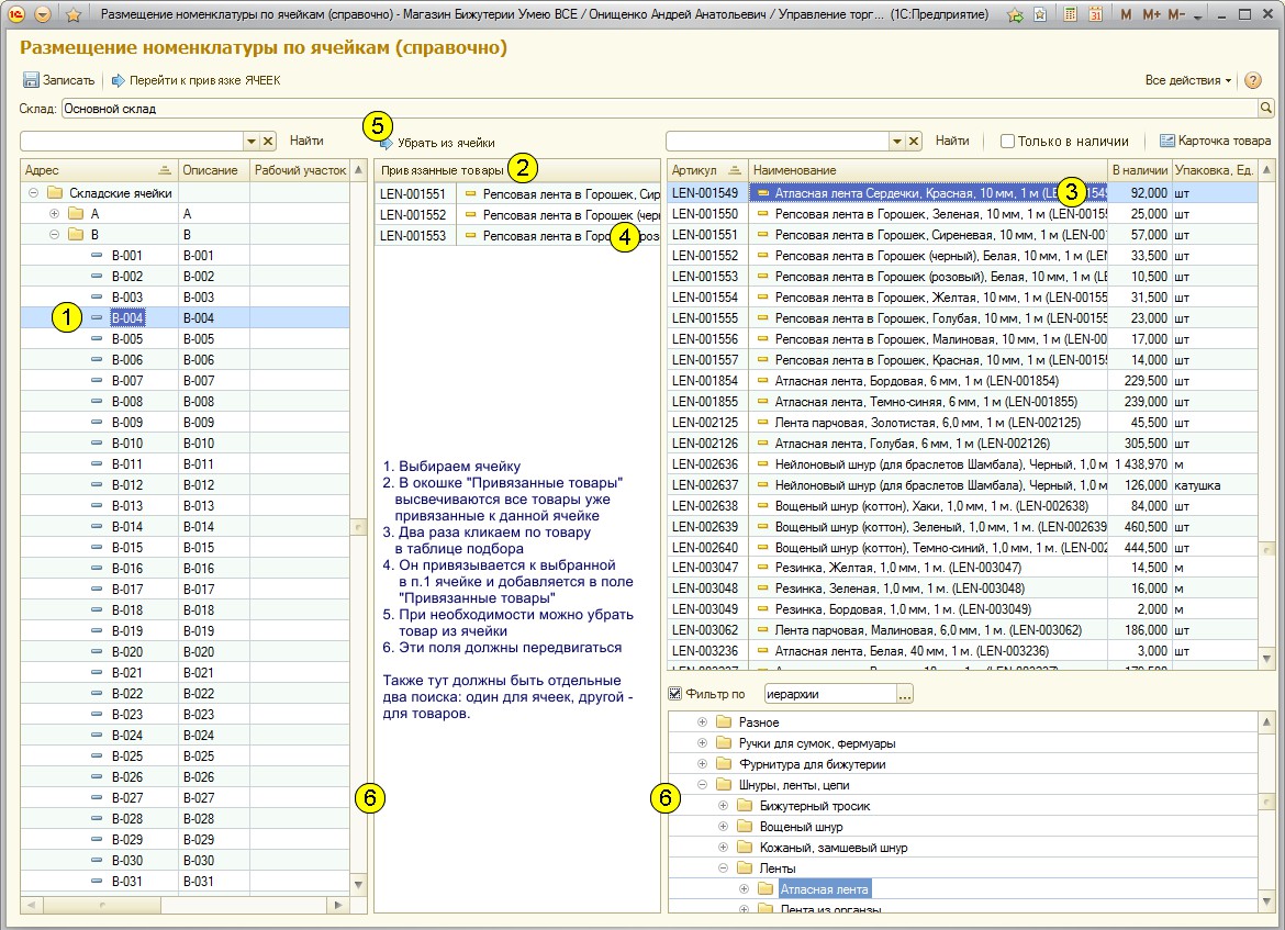 Порядок работы привязки Ячеек к товару должна быть как в стандартной "Размещение номенклатуры по ячейкам (справочно)"