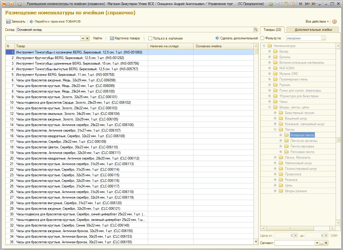 Разработать внешнюю обработку для "привязки" товаров к ячейке