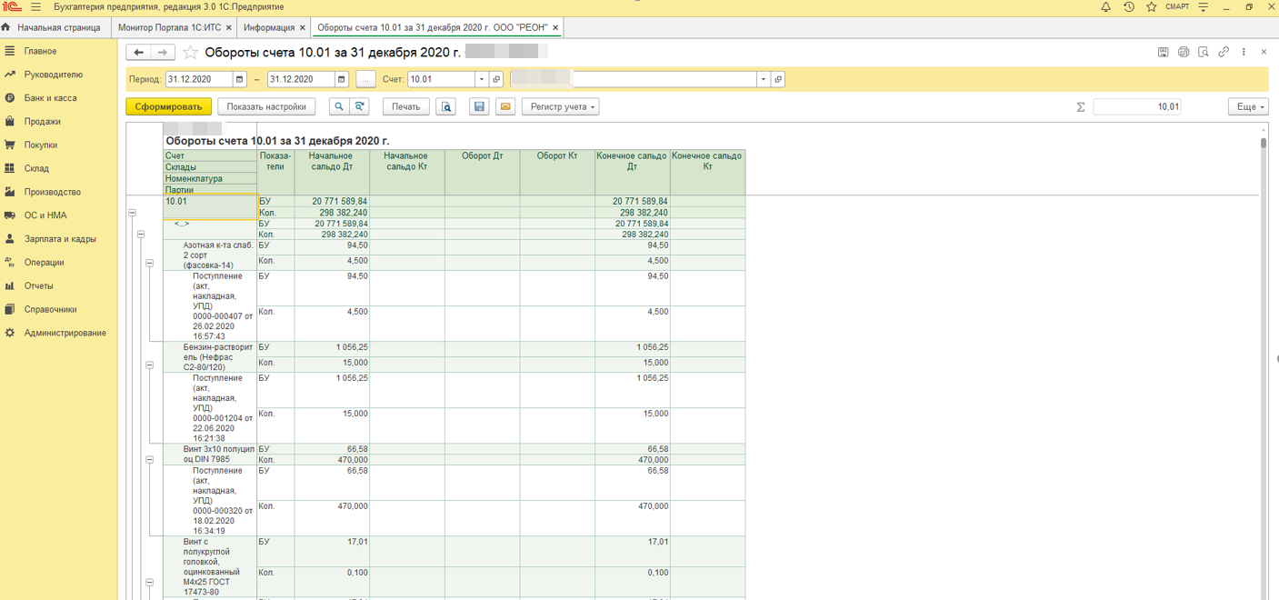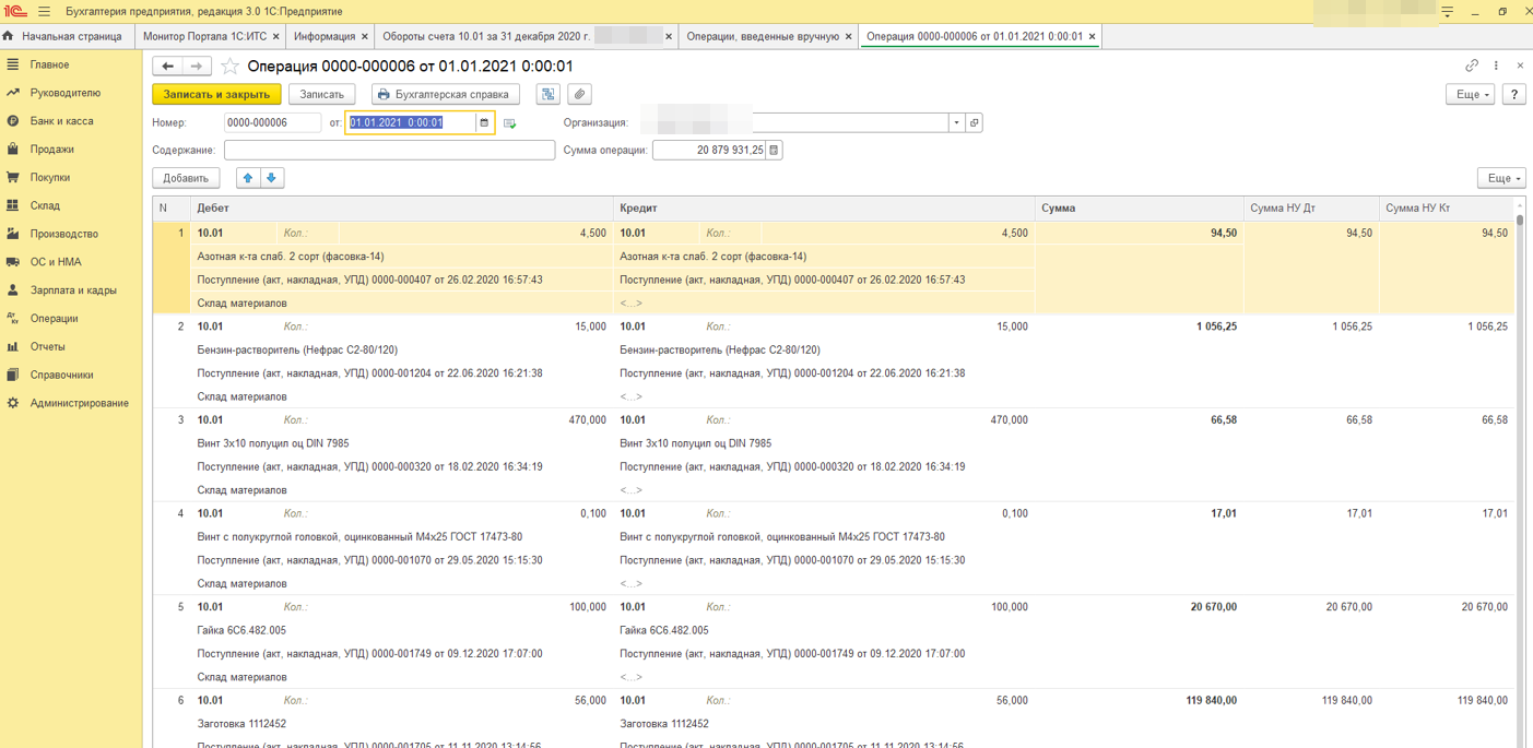 Изначально в программе учет МПЗ велся без учета складов. С 01.01.2021г. включили этот параметр. И получилось, что текущие документы проводятся с субконто склады, а в прошлых этого субконто нет и при проведении некоторых списаний(реализаций) затрагивающих остатки с предыдущих периодов выходит ошибка из-за того, что склад был не заполнен. Нужно чтобы обработка создала документ «Операция введённая вручную» перемещающий товары с пустого склад на склад материалов. Т.е. берутся остатки по счетам 10 и 41 на 31.12.2020г. в разрезе партий и по КТ заполняются номенклатура, количество сумма, партия, а по ДТ эти же данные плюс склад. Склад нужно выбрать один на всю номенклатуру.