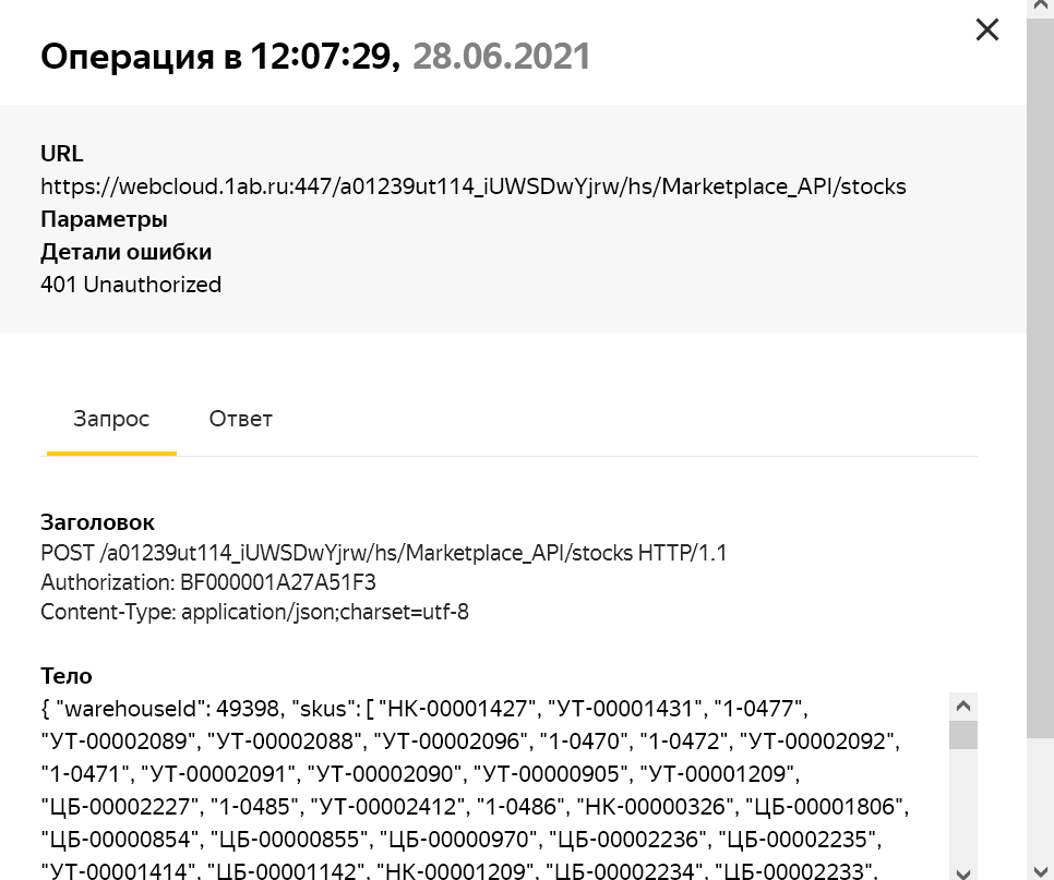 Найти причину ошибки 401 Unauthorized обмена официального модуля ЯндексМаркет