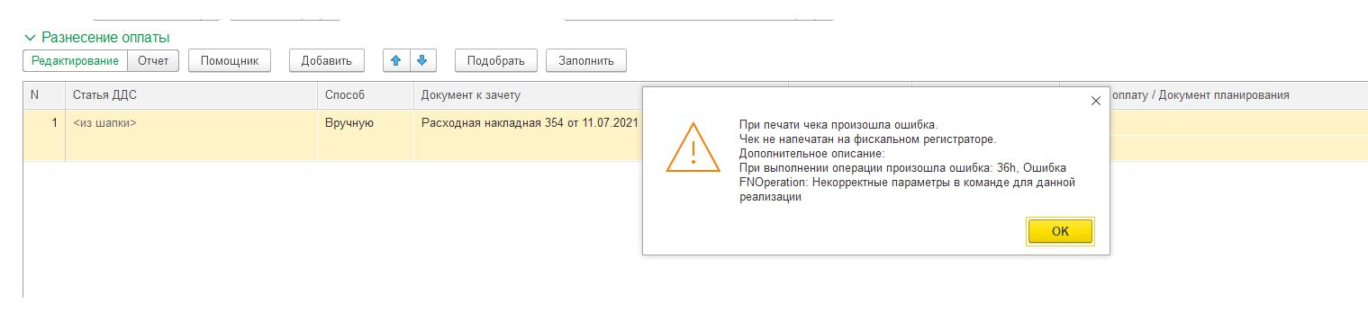 Создается Поступление в кассу на 3 000 руб., все проводится ок, но чек не пробивается (хотя просмотр чека работает).