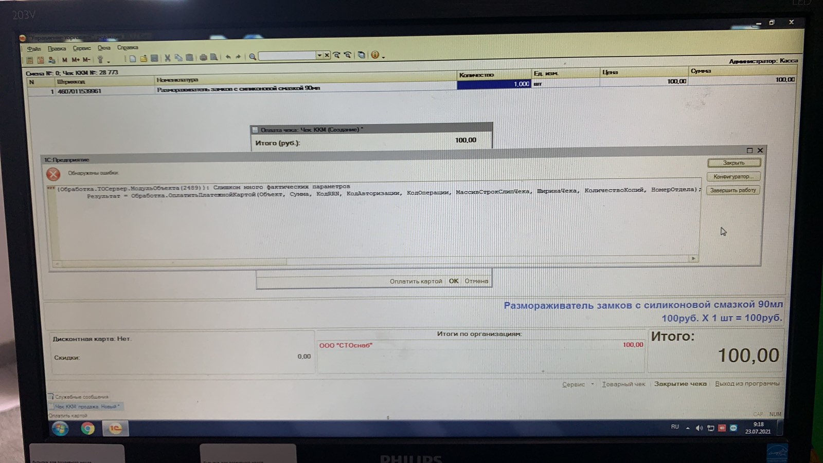 Обработка обслуживание от Inpass InpasDualConnector81_v1.epf подключенна, тест проходит, но при попытки провести оплату выходит окно с ошибкой, Слишком много фактических параметров