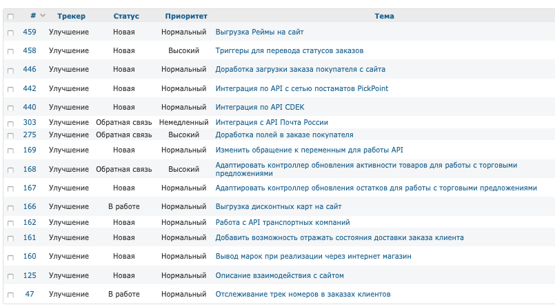- работаем через трекер задач redmine, там же подключается аккаунт git, чтобы сохранялось версирование доработок и изменений