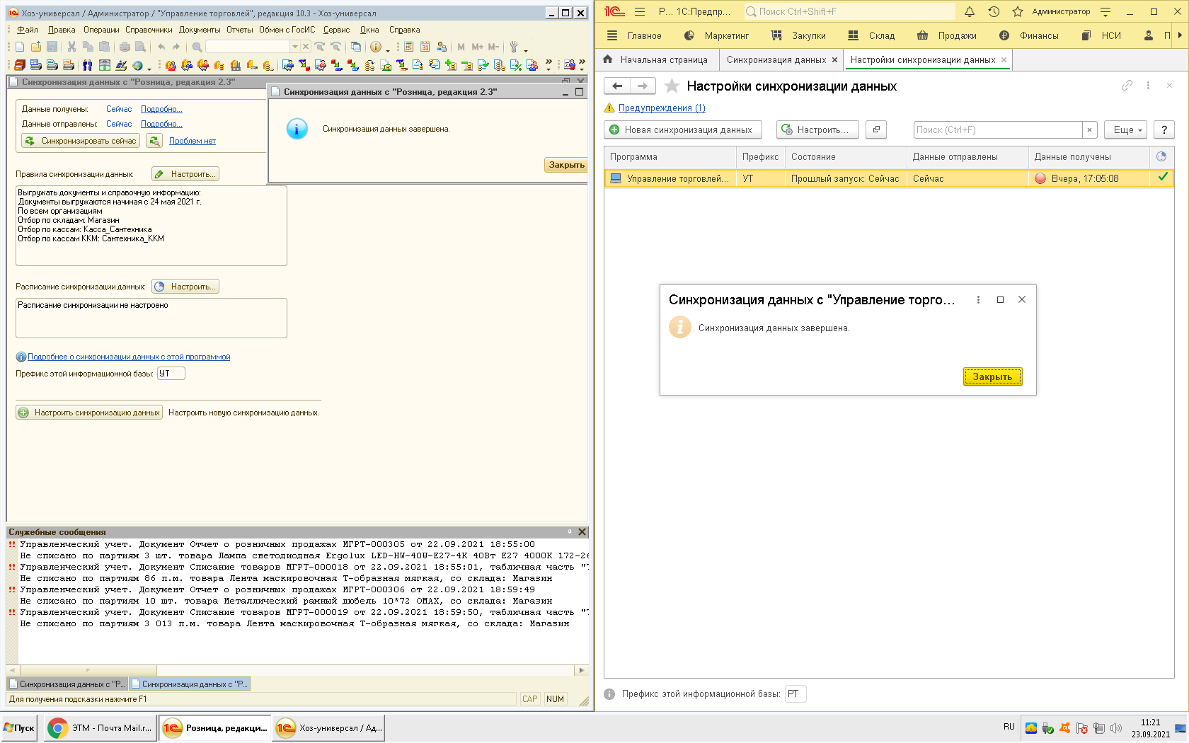 Нужно наладить Обмен данными между УТ 10.3 и Розницей 2.3