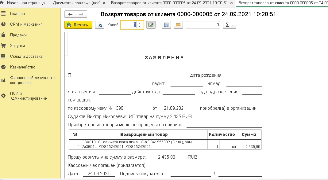 Здравствуйте. В 1С УТ 11 есть документ "Возврат товара от клиента". В нем есть печатная форма "Заявление на возврат" (см вложение).