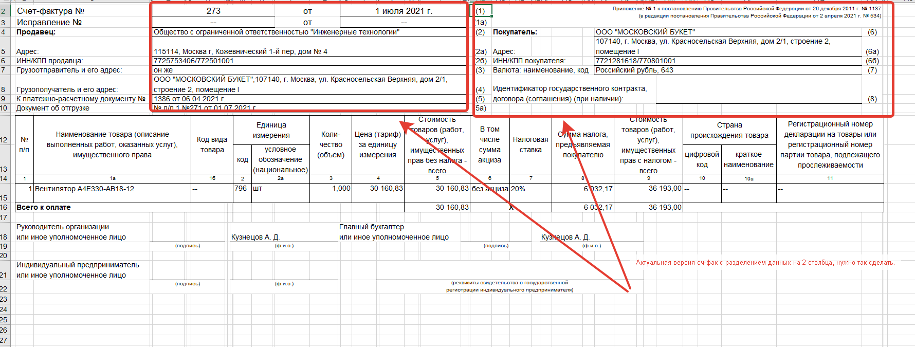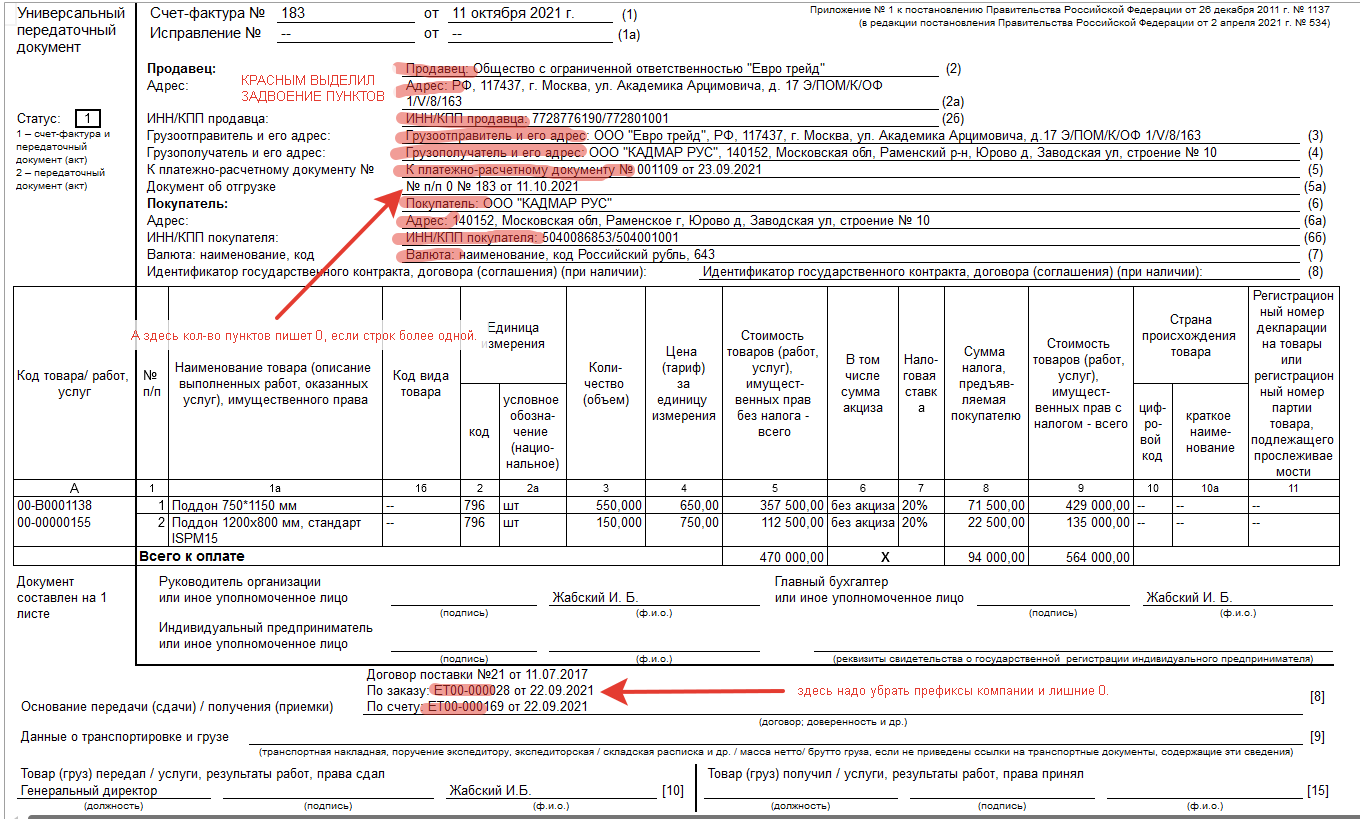 Комплексная автоматизация. Не обновляем, много сделано конкретно под нас. Из-за этого делались внешние формы обновленных УПД и сч-фактур. Надо исправить ошибки прежнего программиста или сделать заново. Привести печатные формы в соответствии с последними требованиями где пункты с данными с 1 по 8 разбиты на 2 столбца (скриншот прилагаю). В текущей форме ошибки (см. скрин): 1. Идет задвоение названия пункта, 2. В пункт 5а выводится неверная информация по количеству строк товара, 3. Основание передачи товара, подтягиваются документы с префиксами организации в формате ЕТ-000167, а должен быть просто номер 167 (этот пункт под нас допиливали).