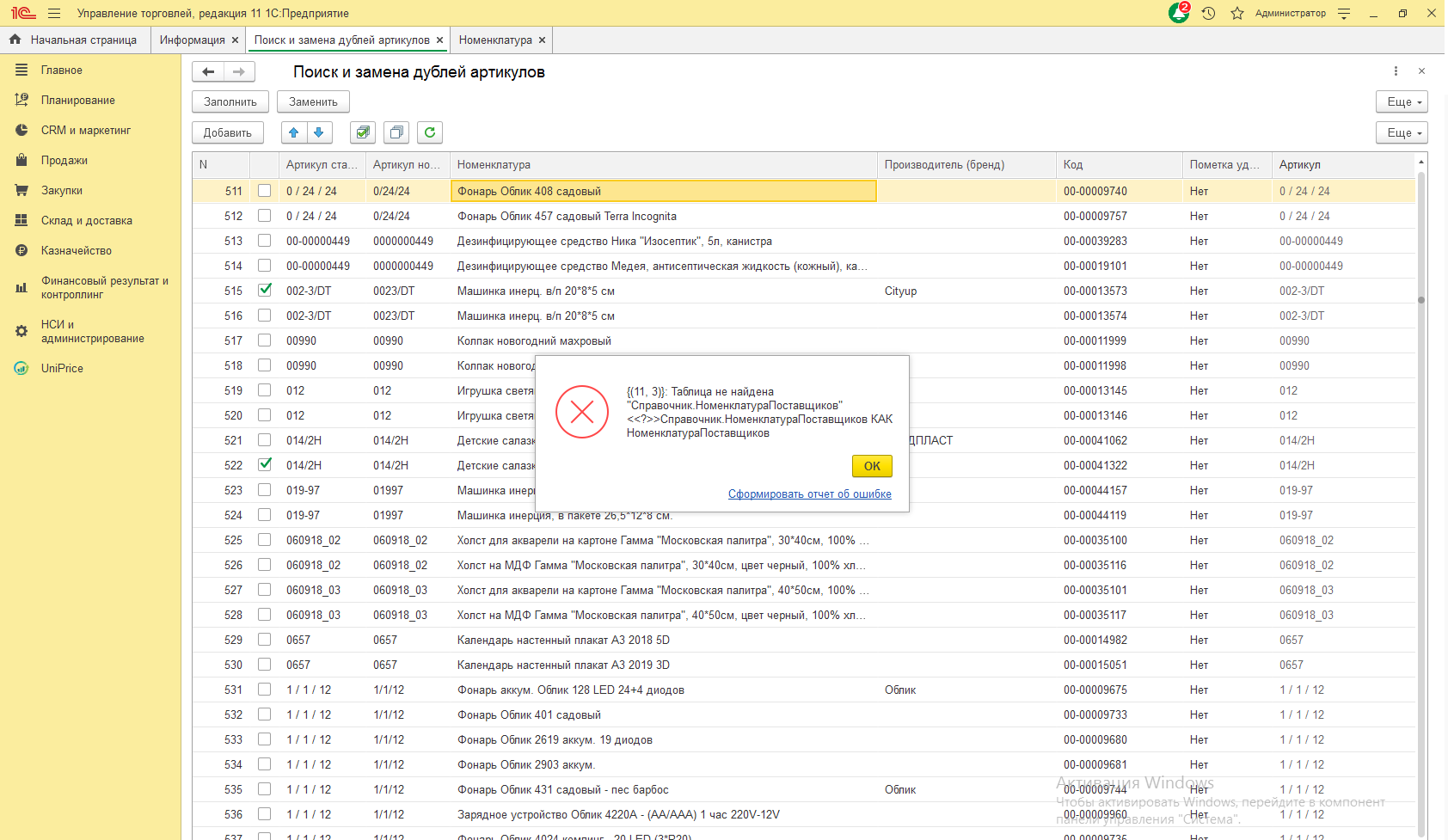 {(11, 3)}: Таблица не найдена "Справочник.НоменклатураПоставщиков"