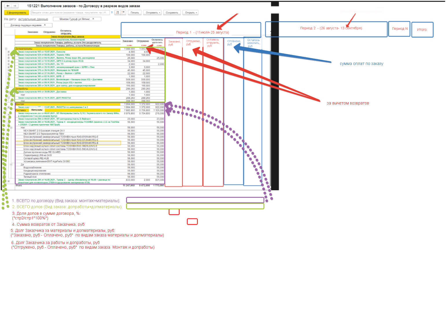 - «Отгружено», «Осталось отгрузить» - данные берутся из типового отчета, а также