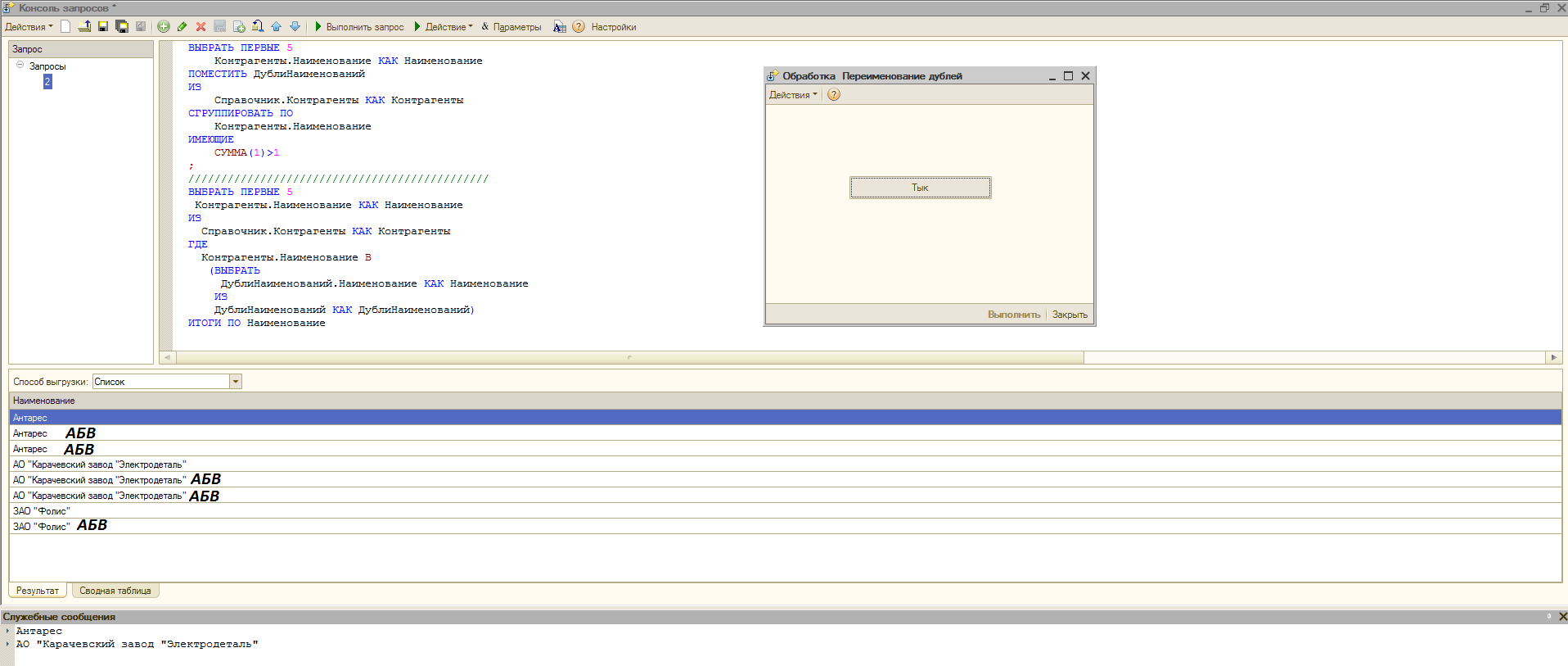 Есть запрос, он выводит дубли Наименований из справочника Контрагенты. Как правильно обойти выборку запроса и для каждого дубля дописать АБВ? Задача простая, данные есть, незнаю как сделать алгоритм обхода дублей.