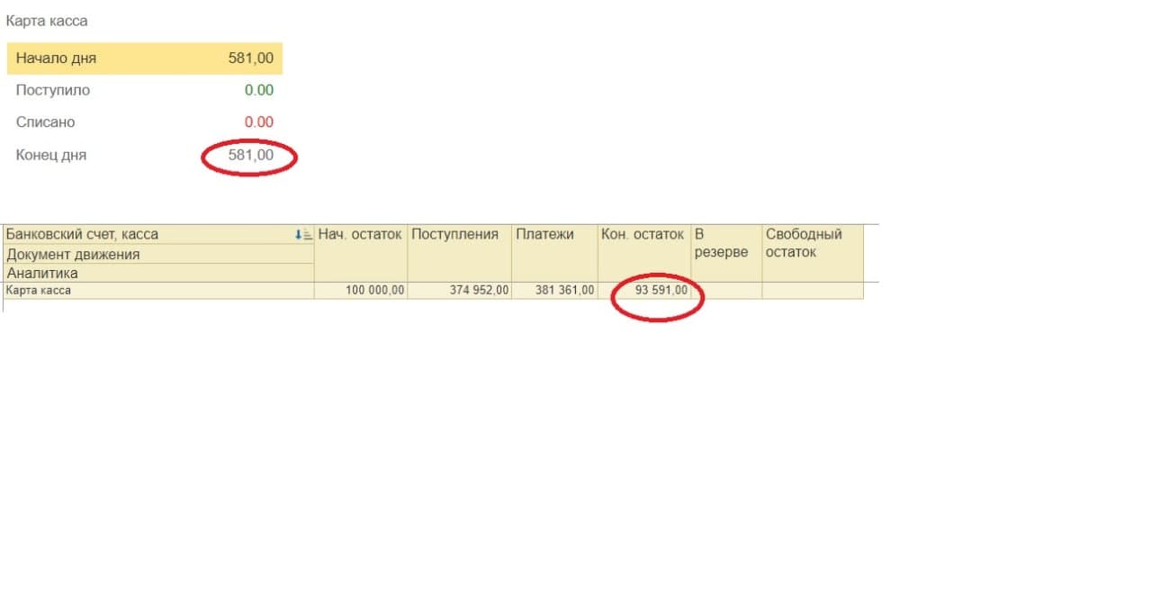1) При формирование отчета деньги по расчётному счёту и кассам отображаются одни остатки, но при этом для работы и в документах доступны другие.