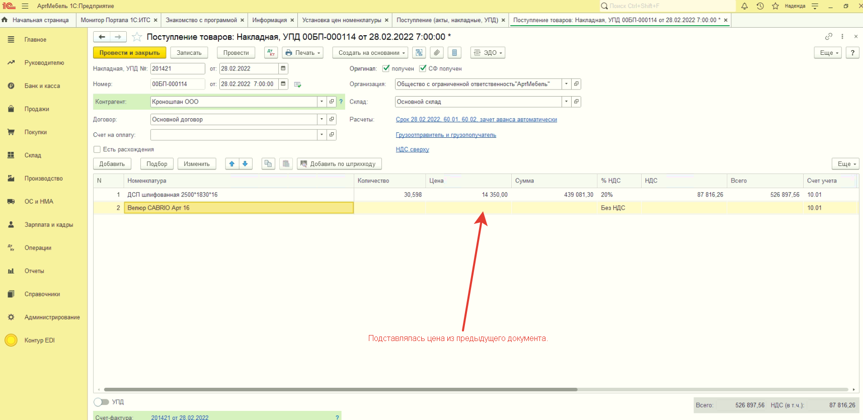 Бухгалтерия 3.0 - добавить возможность добавления закупочной цены из прошлых документов