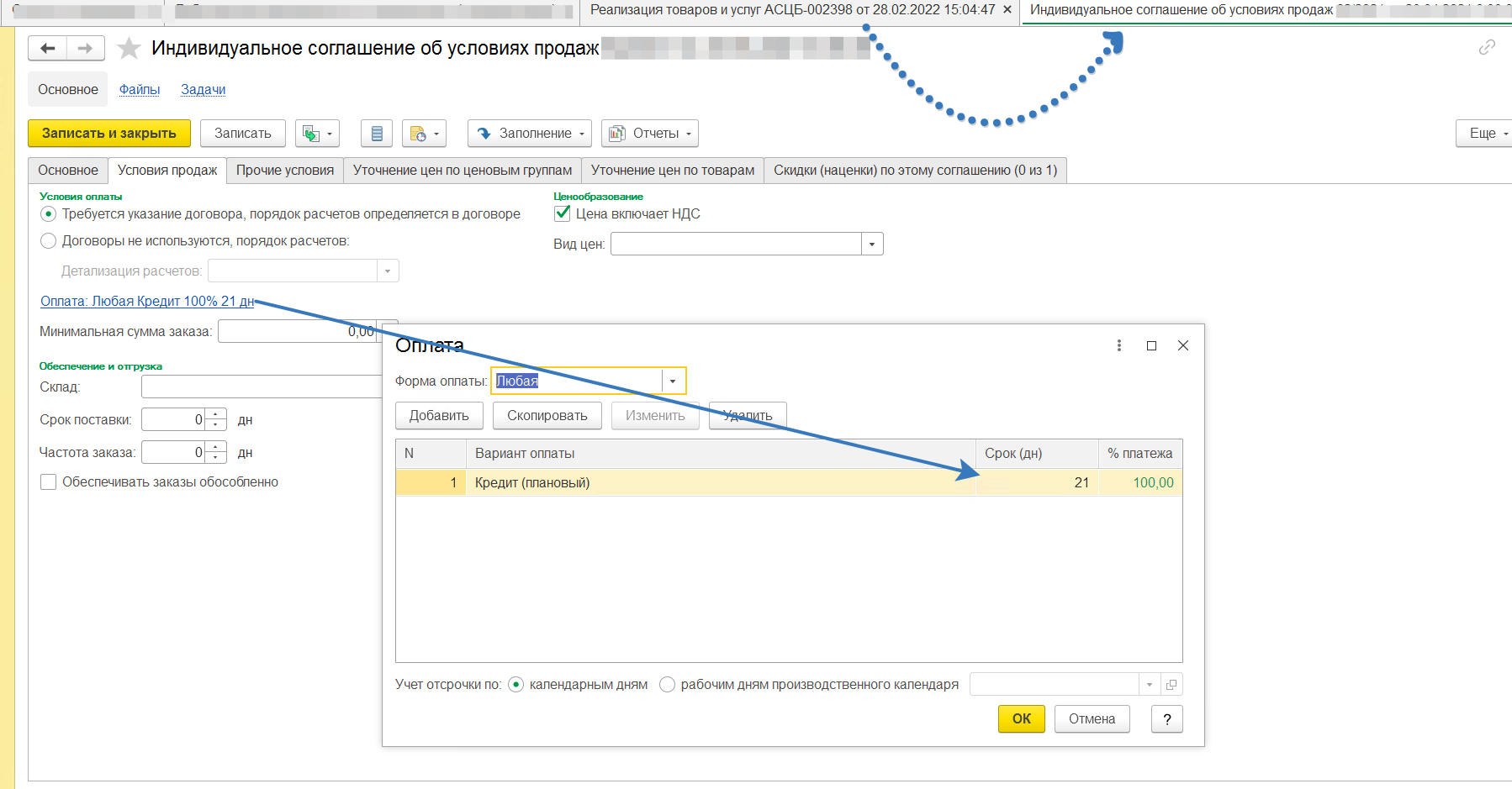 Дата платежа считается просто - "Дата реализации"(дата документа) + количество дней отсрочки (указанное в соглашении). Нужно это для того, чтобы пользователь понимал в какую дату реализация вывалиться в просроченную задолженность.