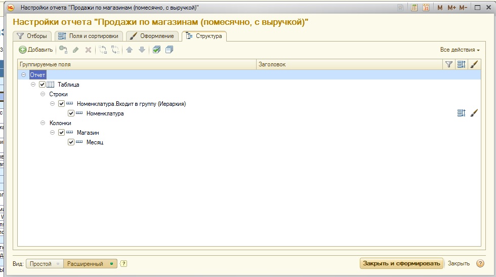 Поле "Месяц" пользовательское, там выражение "Формат(НачалоПериода([Регистратор.Дата], "МЕСЯЦ"), "ДФ = \\\\\\\\\\\\\\\'ММММ гггг ""г.""\\\\\\\\\\\\\\\'")"