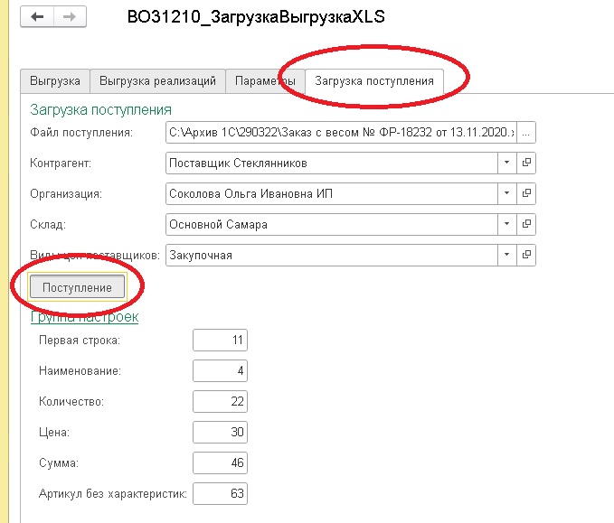 Артикул, наименование товара, количество, цена в файле, цена в 1С.