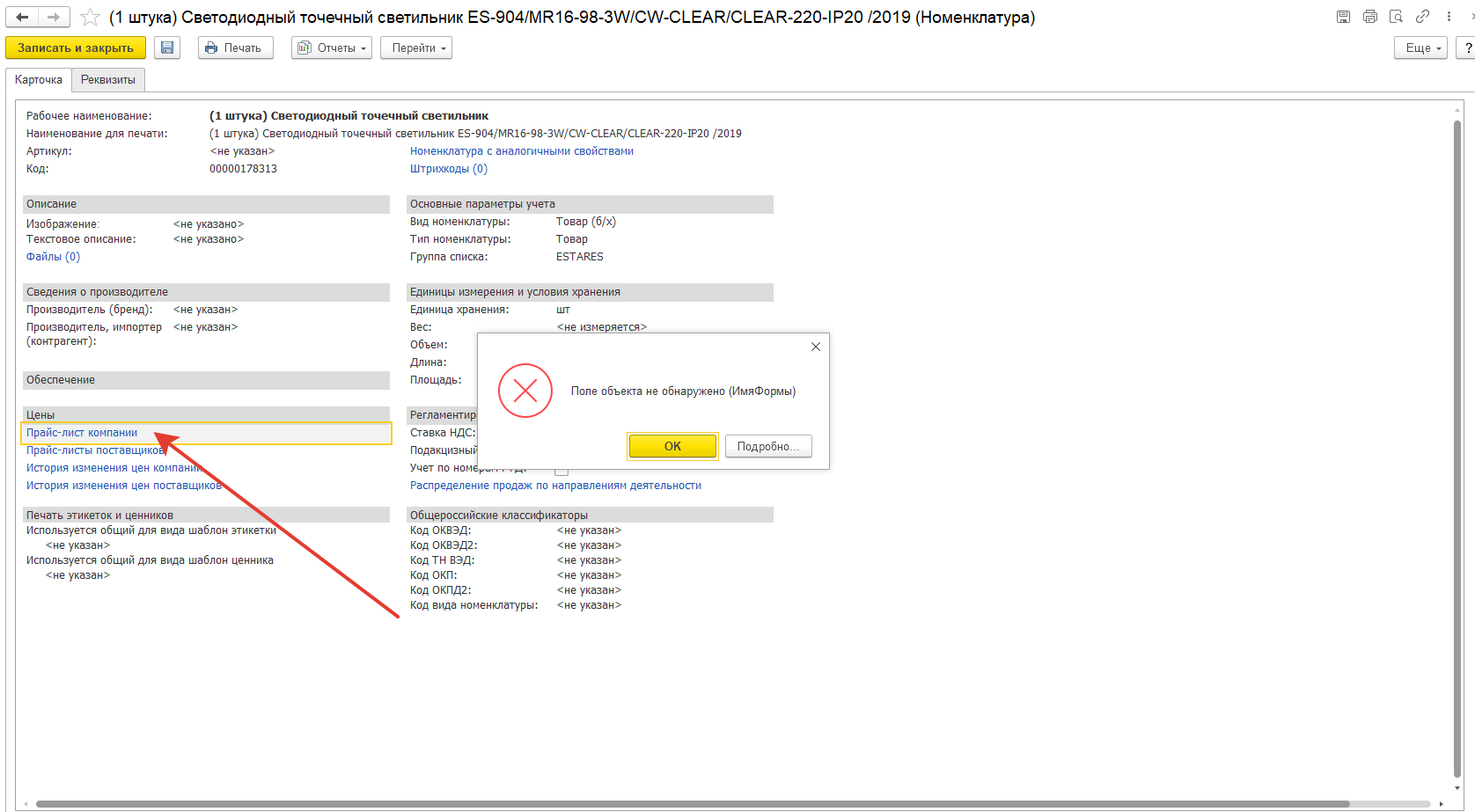 УТ 11.4 - ошибка при открытии прайс листа через номенклатуру