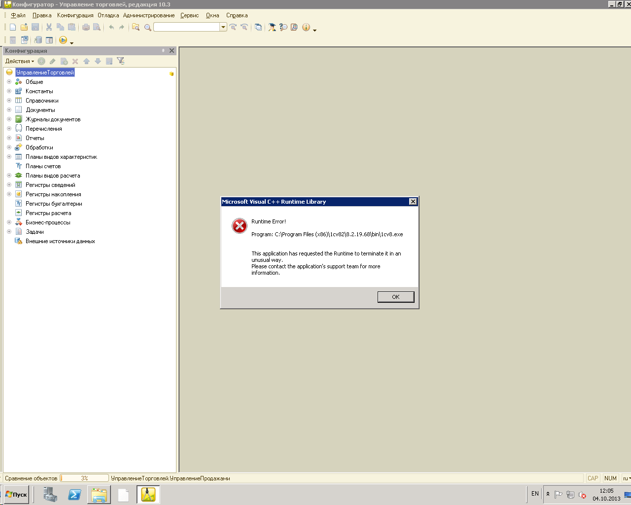 Здравствуйте! Есть задача: Обновить конфигурацию "Управление торговлей", редакция 10.3 (10.3.21.1) (типовая) до последнего релиза. При обновлении на 22 или 23 релиз вылетает ошибка.