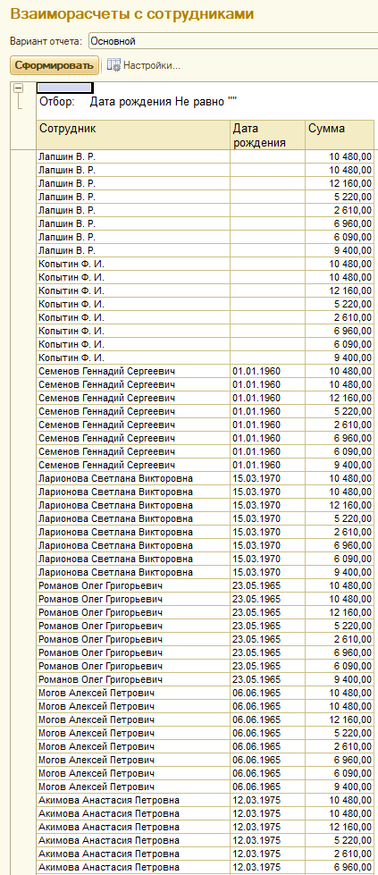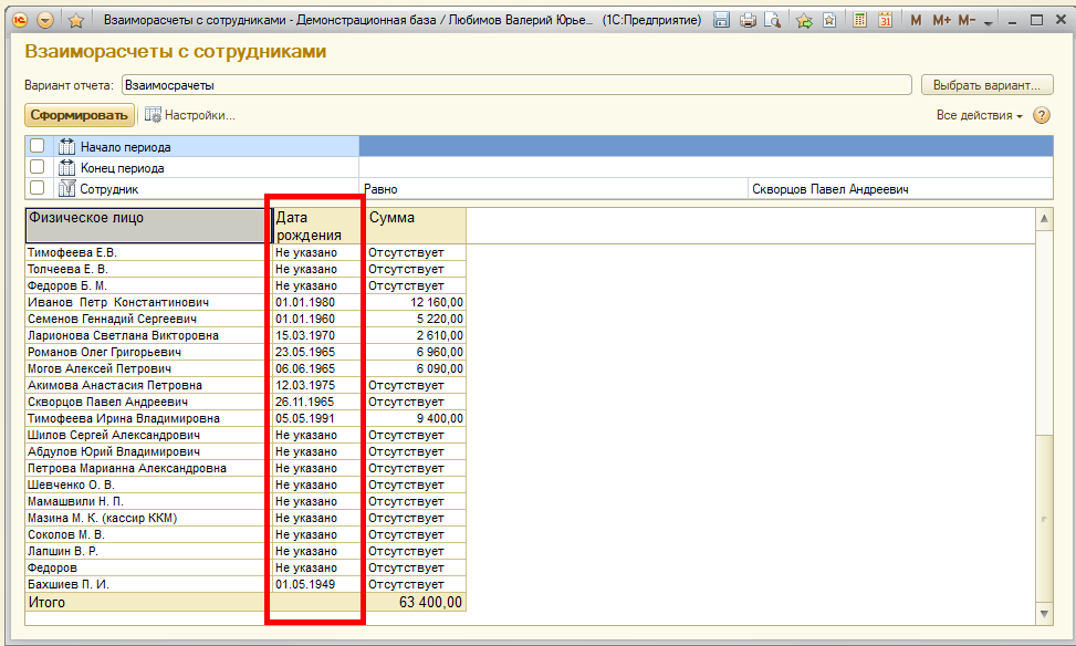 Требуется по условиям задачи доработать отчет "Взаиморасчеты с сотрудниками" таким образом, чтобы в пустых полях на месте даты рождения выводилось "Не указано", а при пустой сумме "Отсутствует". Базу данных в формате дт предоставлю.