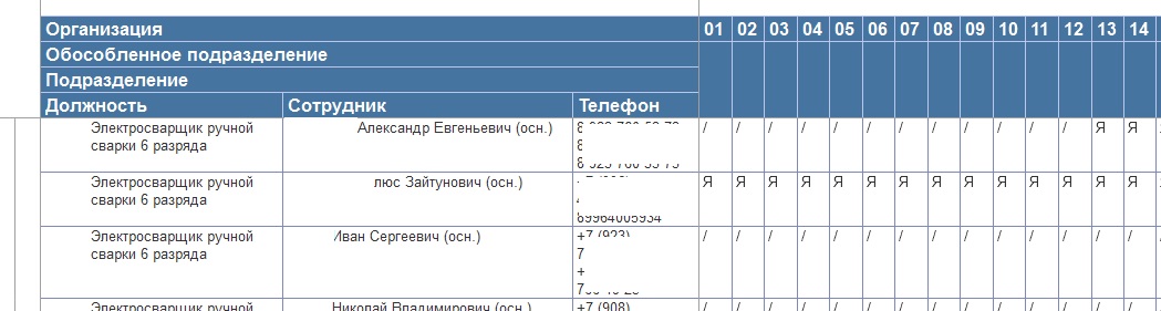 2. Если сотрудник был в отпуске по беременности и родам, например с 15.01.22 по 24.05.22, то почему-то "/" показывается только в мае с 1 по 24 мая. А с января по апрель ставит "Я". Должно быть - с 15.01 по 24.05 "/" .