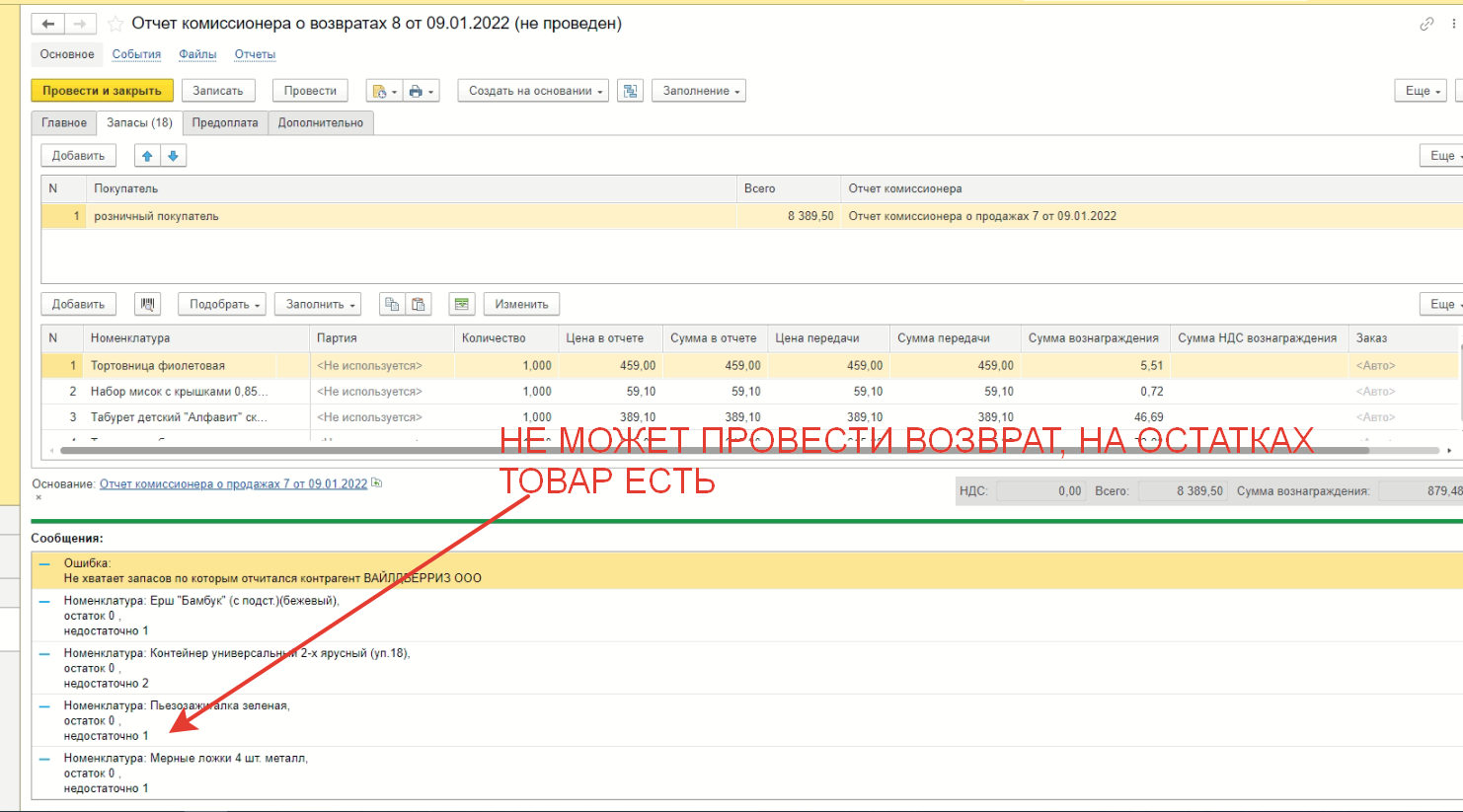 Есть старый возврат за 09.01.22, он не может провестись, т.к. нет остатков.