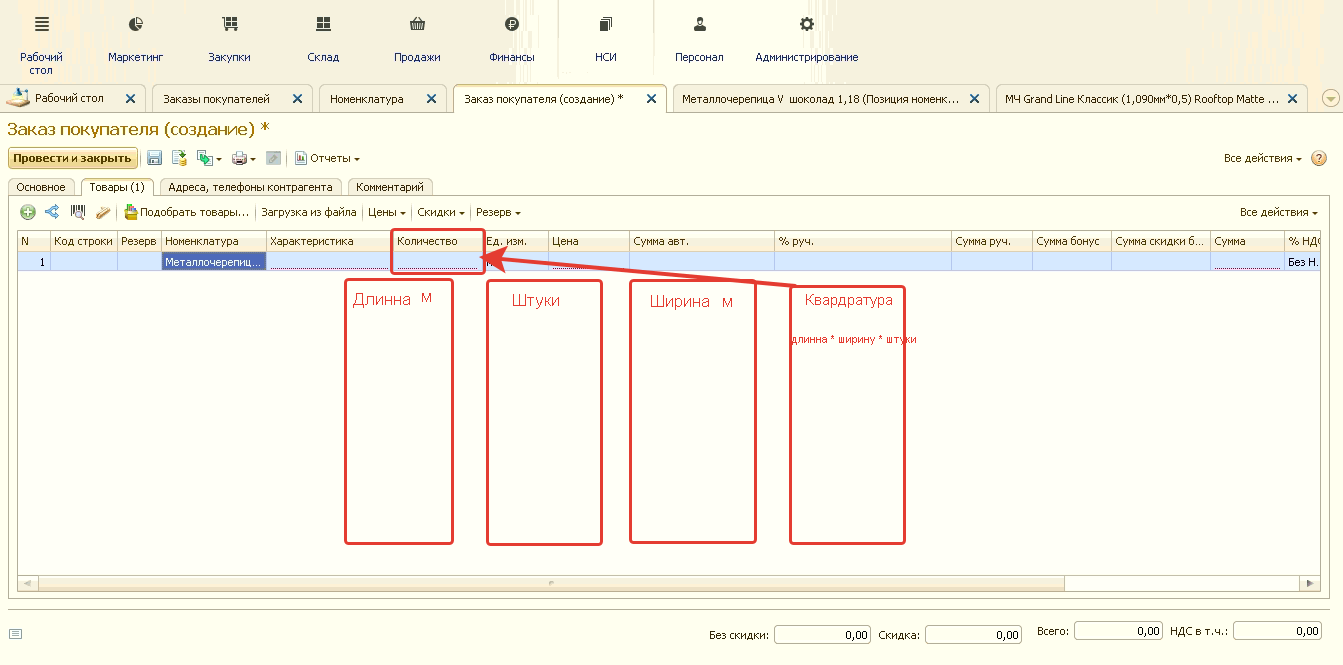 Но в новой версии печатных форм, должна отображаться только колонки Длинна (м), Штуки, с теми данными, которые были вбиты в документе. Так же должны отображаться данные в колонке Количество, в которой идет произведение трех колонок.