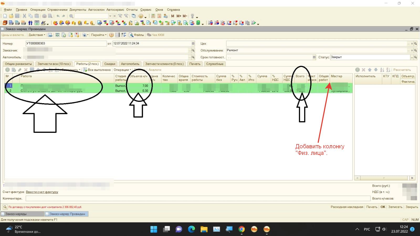 В заказ наряде, на вкладке "Работы", в табличной части добавить новую колонку "Физ. лицо".