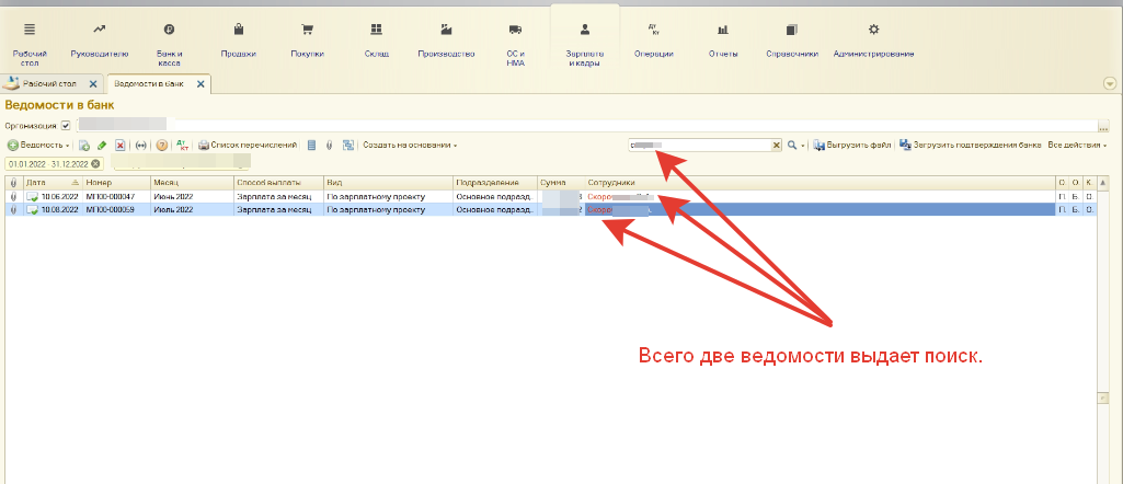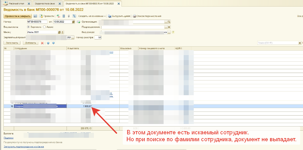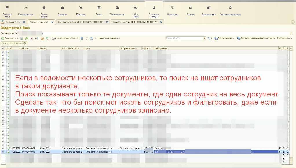 Есть ведомости по ЗП, в них указываются сотрудники. В списке документов ведомостей, есть колонка "Сотрудники", куда по идее, отображаются сотрудники из документа. При поиске, по колонке сотрудников, если ввести сотрудника, отобразяться документы в которых указан один этот сотрудник, если в документе он единственный указан.