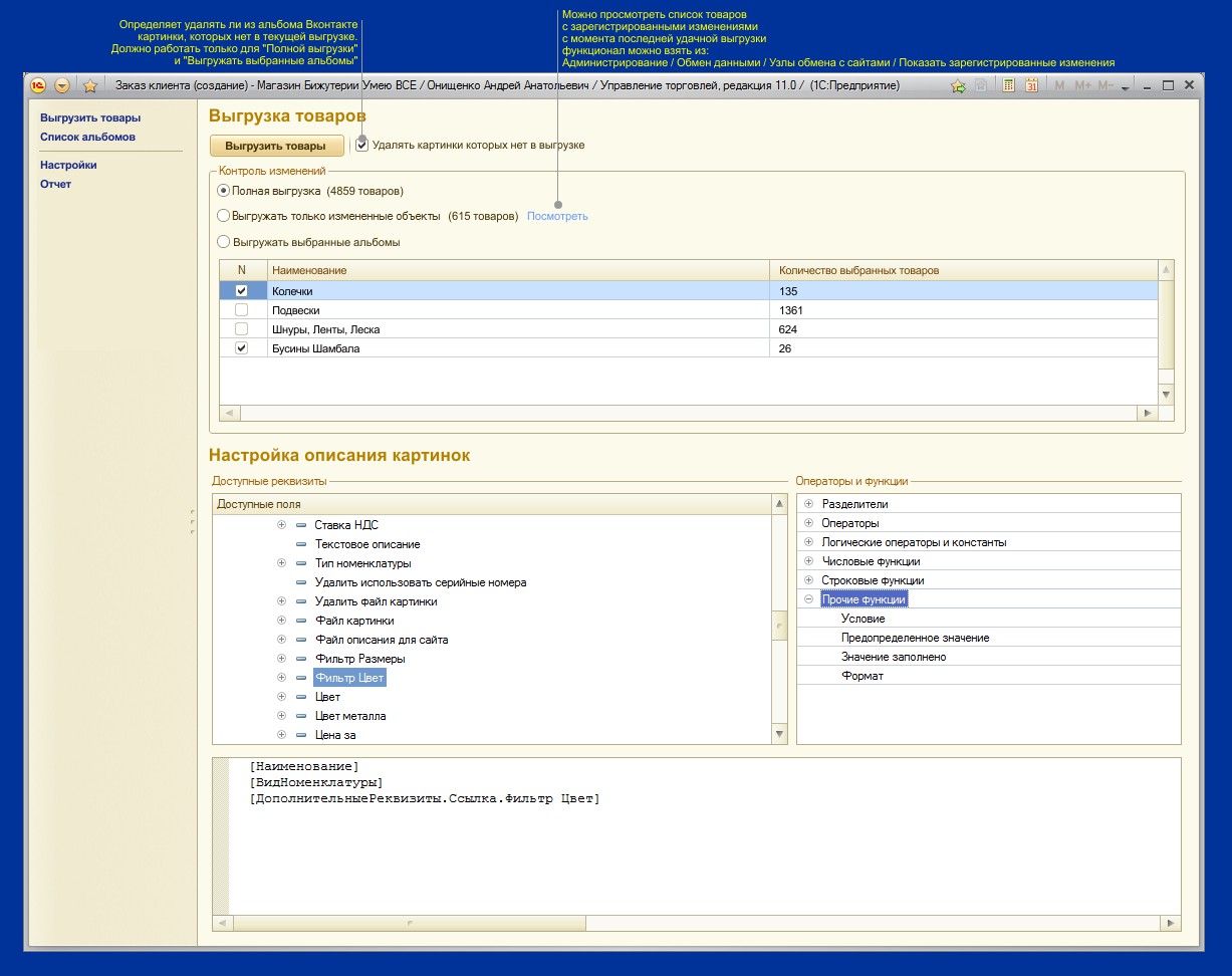 Нужно разработать выгрузку картинок с описанием товара из 1С в фотоальбом группы Вконтакте.