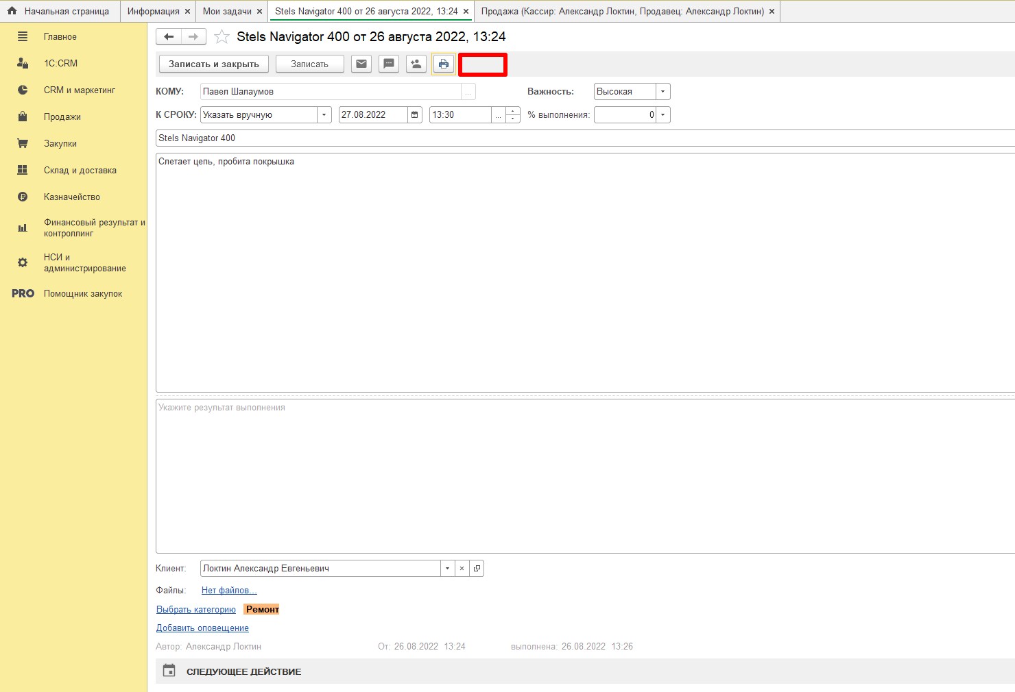 Есть раздел "Мои задачи", нужно к задаче сделать возможность привязать чек ккм, на скрине я пометил красным прямоугольником место где нужна кнопка.