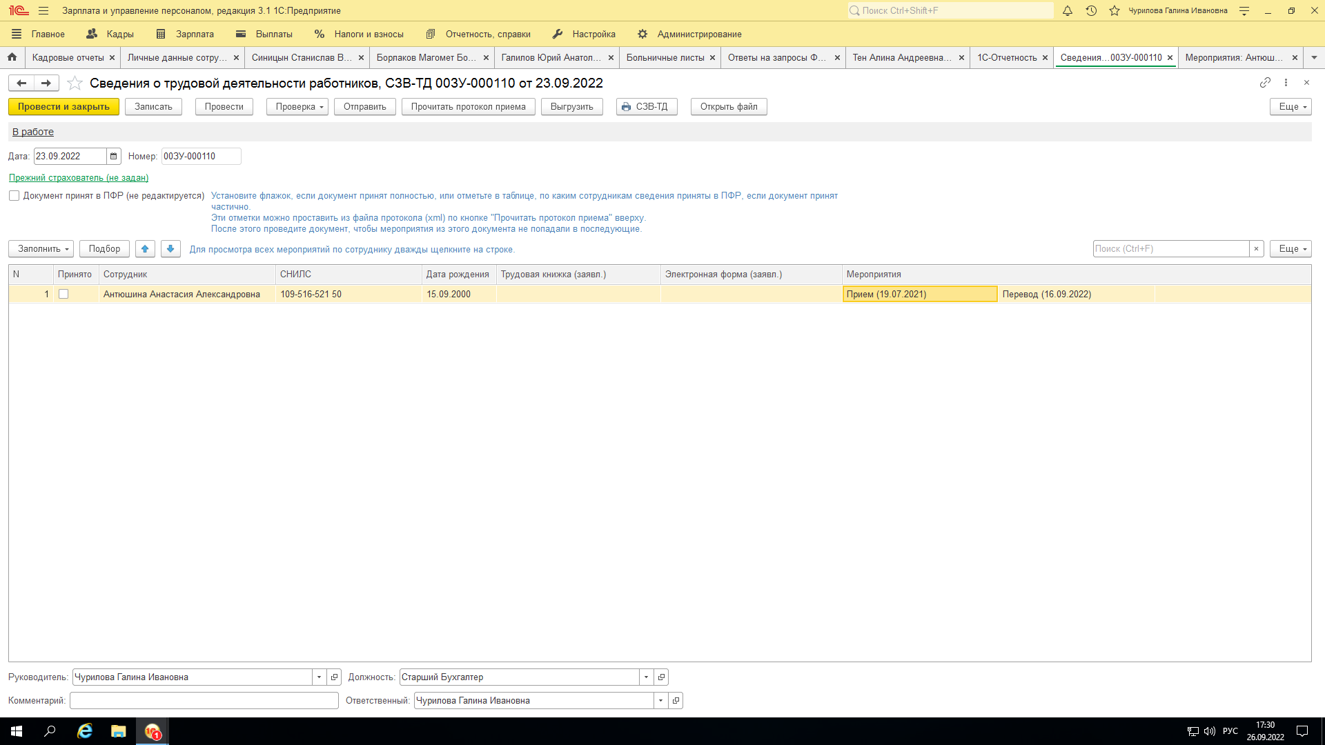 Нужно подать по ней сведения о переводе на новую должность, а в отчет еще попадает ее приказ о приеме и я никак не могу убрать приказ об увольнении.