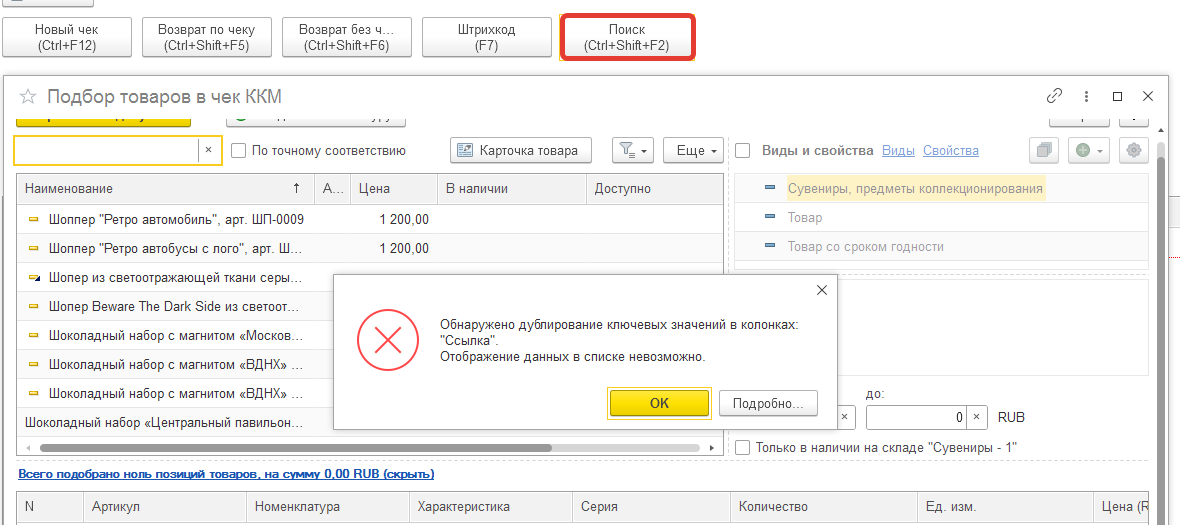 В РМК при нажатии на кнопку "Поиск" (иногда прокручивание списка вниз) выходит ошибка Обнаружено дублирование ключевых значений в колонках: "Ссылка", необходимо устранить ошибку и точное письменное описание способа устранения ошибки.