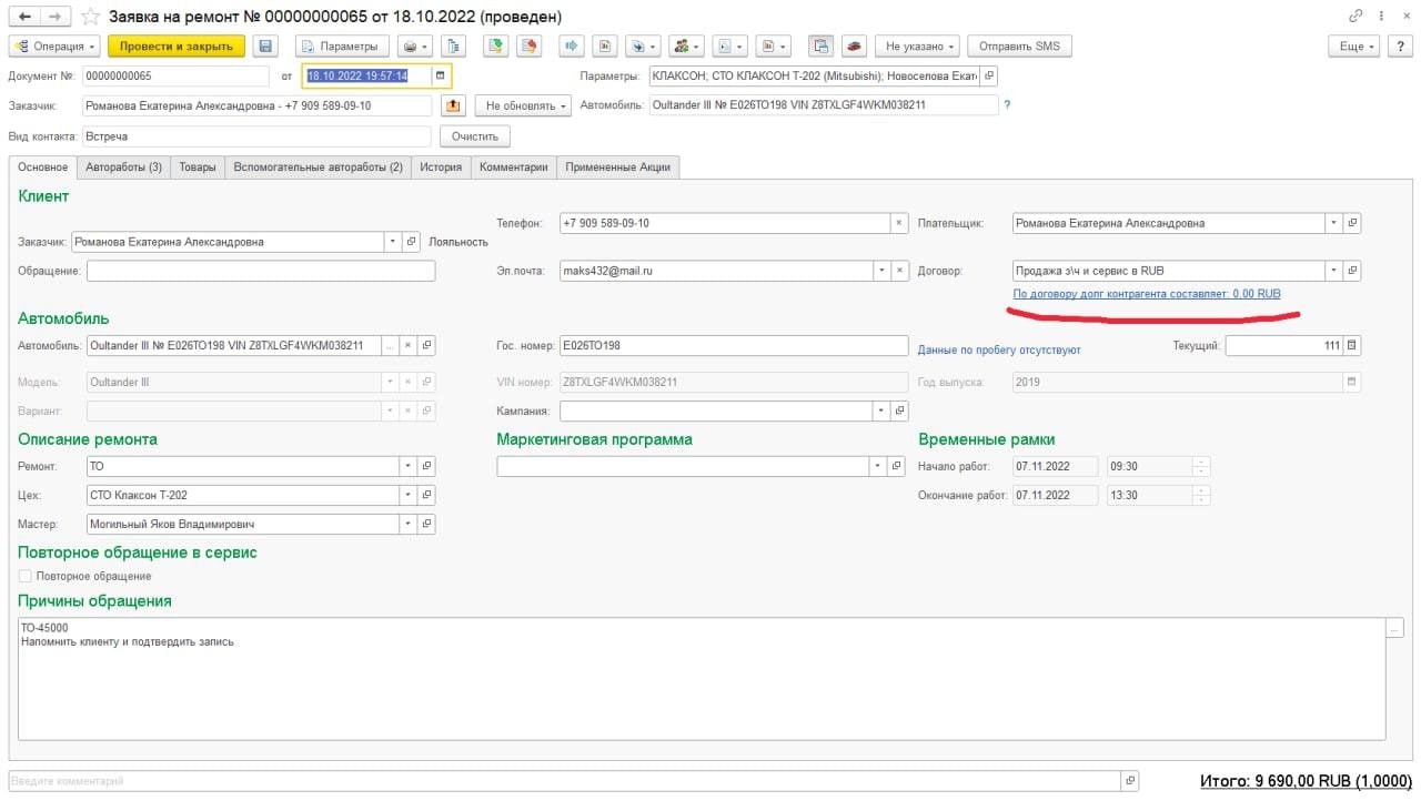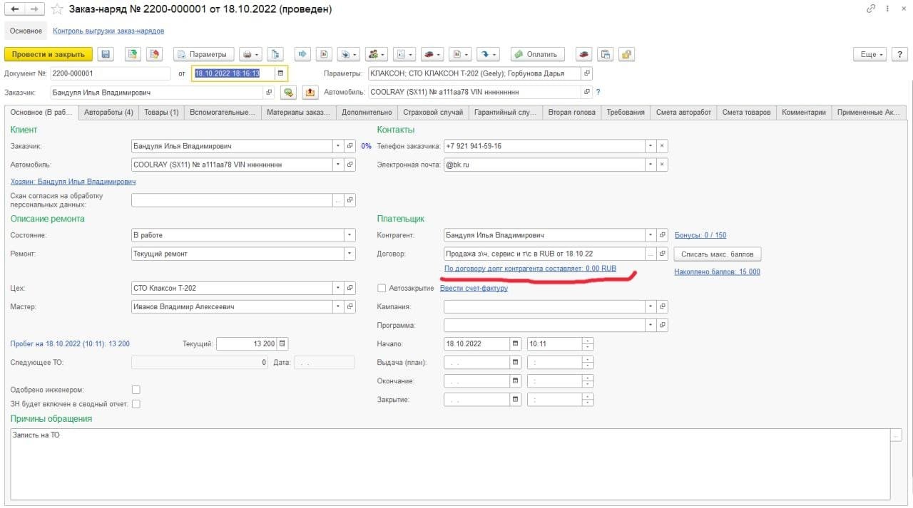 В документах «Заявка на ремонт» и «Заказ-наряд»надпись о долге контрагента сделать красного...