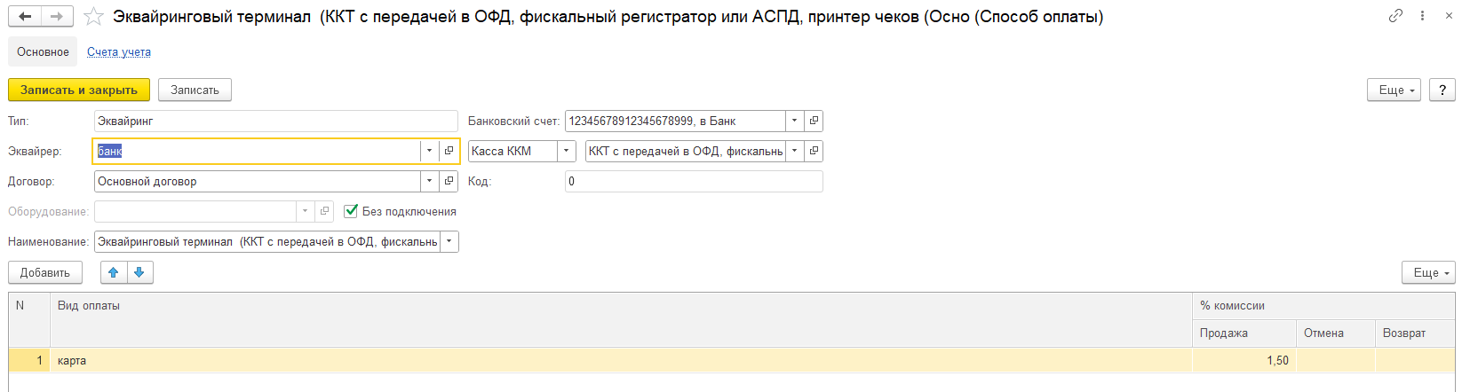 Эквайринговый терминал у нас напрямую шнуром к компьютеру не подключен. Но фиксировать продажи по картам нужно в 1С. Раньше в более старых версиях в "подключаемом оборудовании" был "эмулятор эквайрингового терминала". Сейчас его там нет. Решил просто в настройках эквайринга поставить галочку "Без подключения". НО это не помогло - при пробитии через РМК (точнее когда доходит до момента печати чека) выдает ошибку "Ошибка пакетной фискализации чека Эквайринговый терминал не подключен.