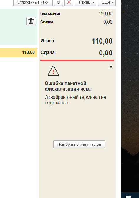Ошибка пакетной фискализации чека Эквайринговый терминал не подключен