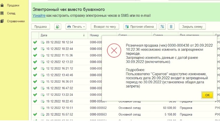 1С Бухгалтерия 3.0 релиз 3.0.126.18. Пользователи работают с базой через RDP, к базе подключено несколько ККТ Атол (11 и 30 Ф). С некоторых пор у одного пользователя при закрытии кассовой смены возникает ошибка (обращение к старому чеку по которому уже сформирован отчет о розничных продажах -см. скриншет) и смена не закрывается, док. "Отчет о розничных продажах" не формируется. Нужно разобраться в чем тут дело